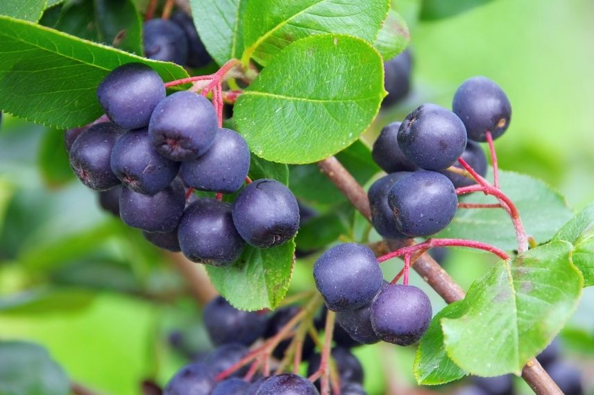 L’Aronia est un arbuste américain très rustique qui produit des drupes noires ou rouge foncé riches en anti-oxydants. On peut manger les fruits frais, séchés ou cuits (en tarte ou en confiture par exemple). La récolte se fait à la fin de l’été jusqu’au mois de décembre. L’une des variétés parmi les plus productives est l’Aronia prunifolia ‘Viking’.