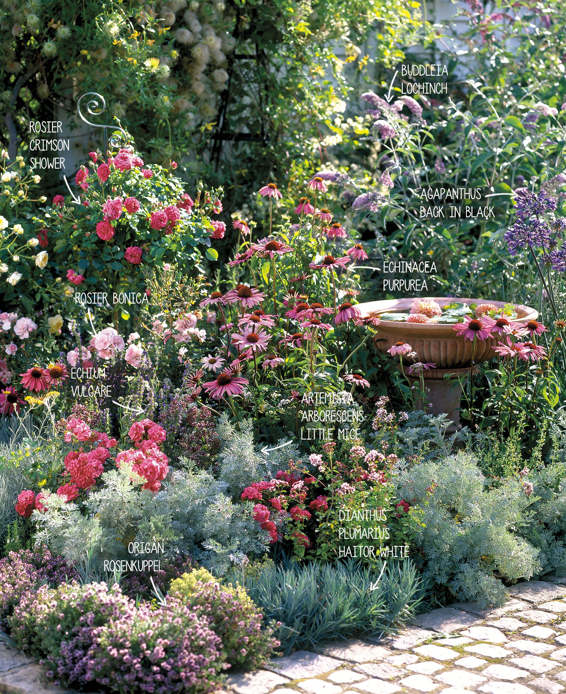 Symbole de romantisme et de passion, la couleur rose, ici représentée par les rosiers et les echinacéas, est tempérée par quelques touches froufroutantes du gris de l'armoise Little Mice. Le gris, positionné au pied de la scène sublime le rose, l'ensemble est accessoirisé de poterie et de structures en fer forgé qui complètent la scène.