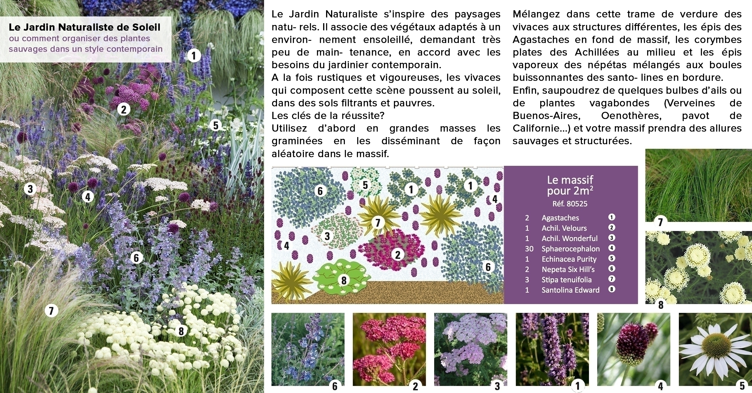 - Mélangez dans cette trame de verdure des vivaces aux structures différentes, les épis des Agastaches en fond de massif, les corymbes plates des Achillées au milieu et les épis vaporeux des népétas mélangés aux boules buissonnantes des santolines en bordure.