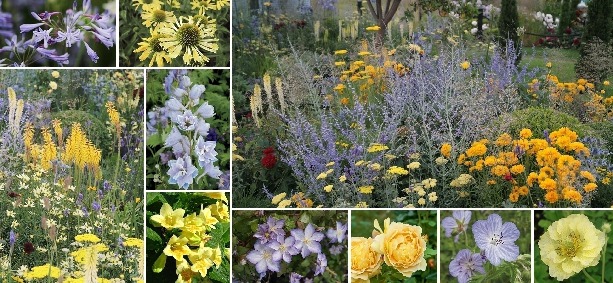 Le jardin jaune et bleu se compose de deux couleurs pures du cercle chromatiques. Ces teintes contrastées se complètent parfaitement. Les fleurs bleues, disséminées par taches éparses, tempèrent la puissance des fleurs jaunes qui rythment le massif. Ce savant mélange créé une harmonie visuelle stimulante, qui tantôt apaise le regard, tantôt l'excite, c'est le yin et le yang du jardin de couleur.